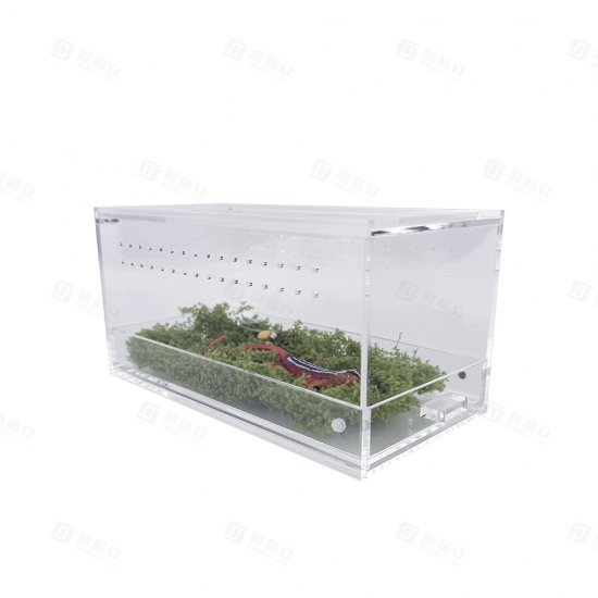 Fabricado em acrílico transparente durável, este suporte proporciona total visibilidade para observar o comportamento do réptil; seu design tipo gaveta facilita a limpeza e o acesso do animal, e os orifícios de ventilação garantem a circulação adequada de ar, tornando-o uma opção prática e segura para donos de répteis.