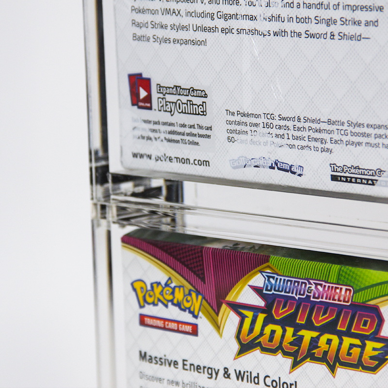 Fabricado em acrílico de alta qualidade e resistente a riscos, este protetor empilhável oferece durabilidade prolongada, protegendo caixas de boosters contra poeira, arranhões e pequenos impactos. Seu design transparente preserva a visibilidade da arte da caixa, mantendo o conteúdo intacto, e a estrutura empilhável maximiza a eficiência de armazenamento, permitindo que os usuários criem uma exibição organizada e visualmente atraente com várias caixas. Ao contrário das alternativas de plástico frágeis, ele mantém a estabilidade estrutural mesmo quando empilhado, combinando proteção prática com uma apresentação elegante e profissional.