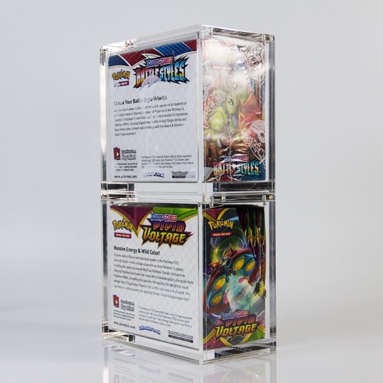 Fabricado em acrílico transparente e resistente, cada estojo protege com segurança uma caixa de boosters, exibindo a arte original através dos painéis transparentes. Várias unidades podem ser empilhadas verticalmente para organizar e exibir coleções sem ocupar muito espaço, sendo ideal para colecionadores de TCG, lojistas ou entusiastas que desejam proteger e exibir seus conjuntos de boosters.