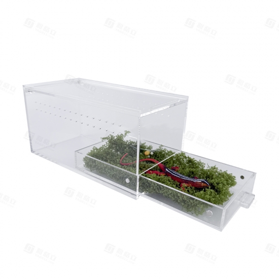 Este terrário serve como um habitat seguro e de baixa manutenção para pequenos animais exóticos: a gaveta deslizante permite trocas rápidas de substrato e limpeza pontual, enquanto o design ventilado mantém a umidade e a circulação de ar adequadas. As paredes transparentes permitem a observação constante do seu animal de estimação, e o material resistente aos raios UV protege tanto o terrário quanto o animal dos danos causados pela luz.